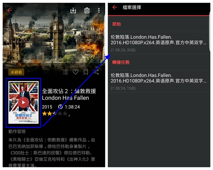▼點選想要的影片,也有詳盡的影片資訊,另外如果之前有設定好離線轉檔,這時就能看到不同的檔案可以選擇。