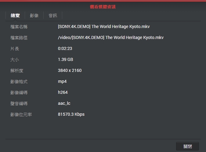 ▼在細部的檔案資訊可以看到, 可以看到影片解析度為3840 x 2160 (4K 2160p) 且影像編碼為 H.264。