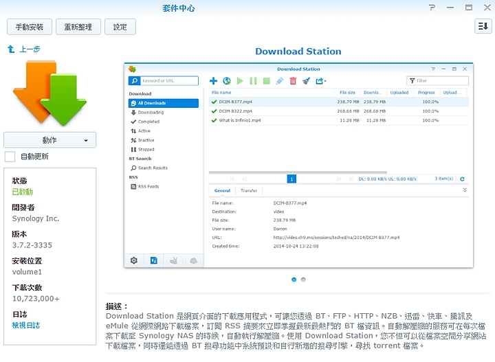 ▼Download Station套件可以在官網上下載,然後透過套件中心予以安裝,過程同樣簡單快速。