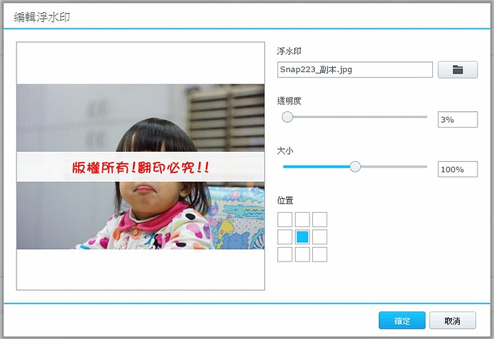 ▼點擊編輯浮水印功能,然後點選要出現的浮水印圖案,DSM 6.0還提供九宮格位置讓你置放想要出現的位置,真的很方便。