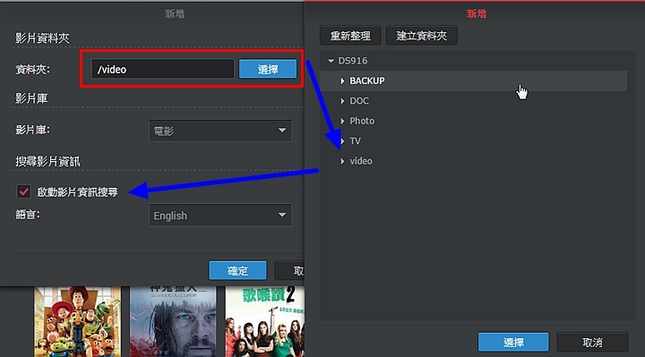 ▼在Video Station伺服器端,你還必須將電影的目錄予以指定,否則Video Station是不會主動辨識出你的影片檔目錄,所以在要特地將你的影片位置予以指定,同時勾選影片資訊搜尋,這樣Video Station就能自動幫你找到影片相關的資訊及海報照片等。