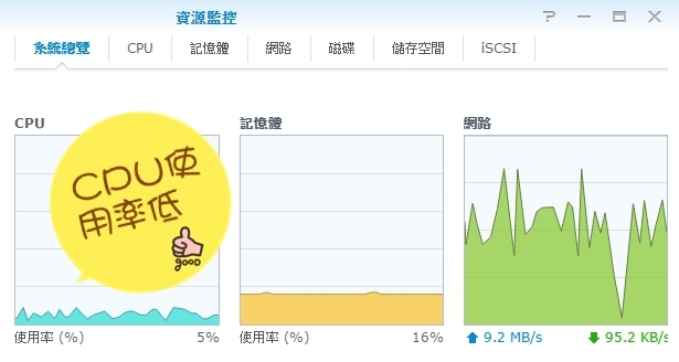 ▼打開資源監控,你會發現到DS916+的CPU使用率很低,這是因為DS916+支援硬體播放4K影片,所以CPU使用率才會這麼低,同時也可以看到,右邊網路傳輸飆高了,因為4K影片檔時在太大了!