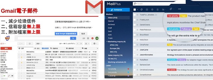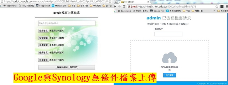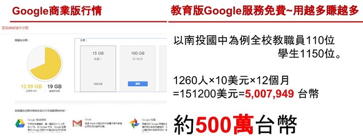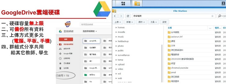 Google教育版的費用是完全免費,但是學校外部網路頻寬是100M,內部寬頻是1000M,在校園內部教學時,使用Synology私有雲是相對較快的,因此,筆者是Google公有雲與Synology私有雲並行。