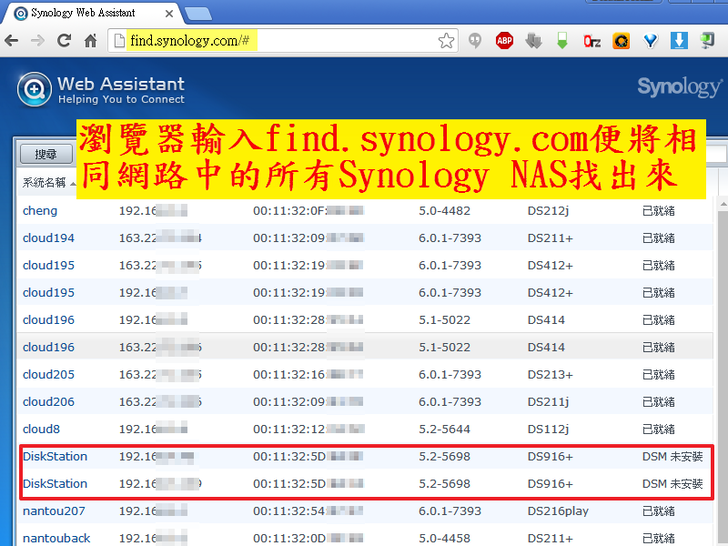 【▼】在瀏覽器輸入fine.synology.com可找尋同網段中的NAS(建議採用)