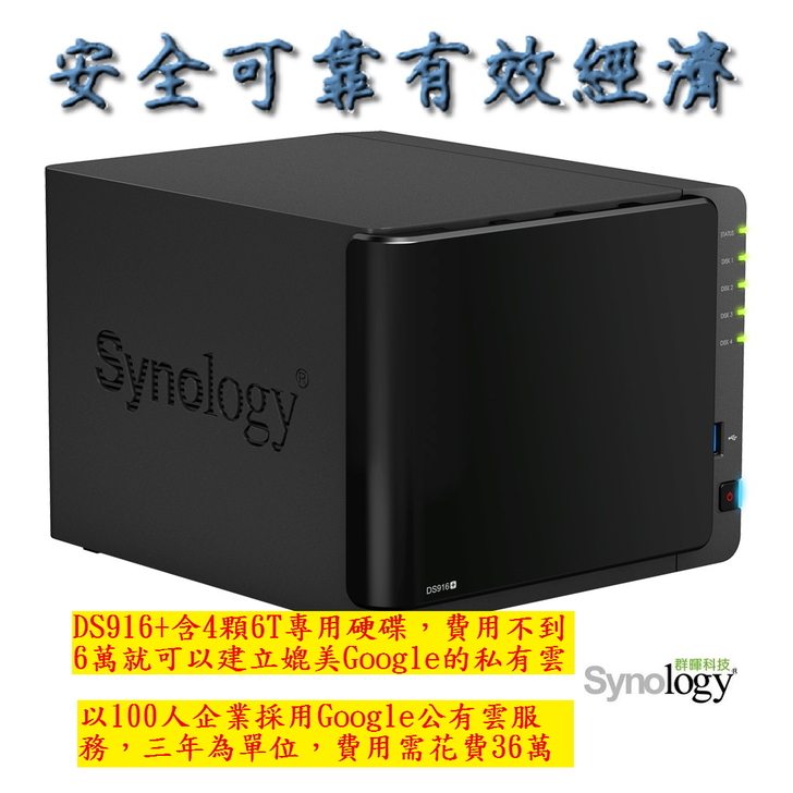 國中小在推展行動學習時,常會用到許多的雲端資源,有太多可以選擇的資源,Google本身擁有許多網路相關應用,筆者就Google與Synology的功能來做一個比較對應,最後,商業版的Google一個帳號一年要1200元,以100人規模的公司三年為一期計算,就要36萬元,才能使用Google公有雲完整的應用服務。使用Synology DS916+ 建置私有雲,就可以相對應的功能,舉凡郵件、相薄、影音平台、部落格等,建置的成本也大幅降低,同時也保有公司資料的安全性。