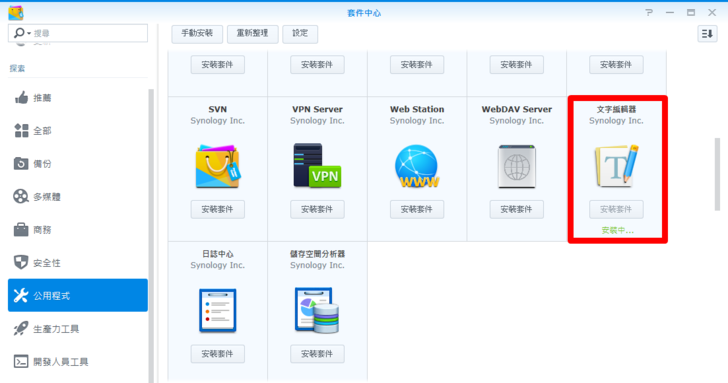 【▼】大家都認為NAS只是一台資料備份機,那是因為還沒看過Synology多媒體的套件,若您認為NAS不就是台多媒體播放與資料儲存合一的機器的話,那小編只能和您說,您對NAS只有50%的熟識,因為DS916+與DSM6結合可以還玩文書處理,厲害了吧!以下就帶大家來了解一下。首先是文字編輯器,安裝方式【套件中心】->【公用程式】->安裝【文字編輯器】->到【主選單】執行即可。