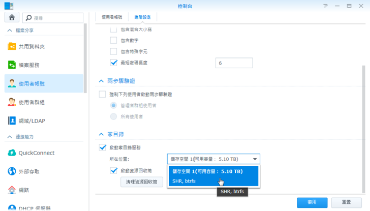 【▼】確認開啟後,也可以看見目前儲存空間是 Synology Hybrid RAID (SHR)自動化磁碟陣列管理系統所建立的btrfs檔案系統。