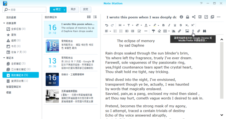 【▼】若是要插入語音的部分,Note Station會要求使用Chrome或Firefox瀏覽器。