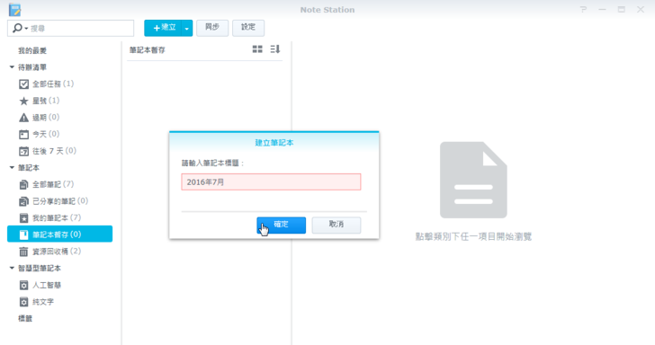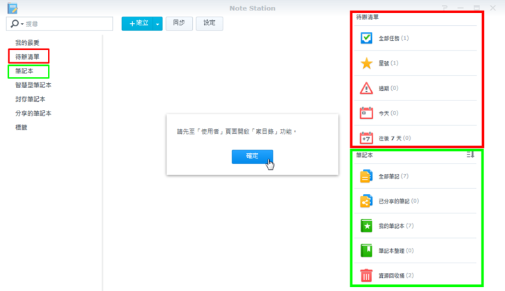 【▼】Note Station主畫面,左半部為工作要項,包含了有待辦事項、筆記本等,右半部就是這些工作要項的內容了,第一次開啟會請您至【使用者帳號】頁面開啟【家目錄】功能。