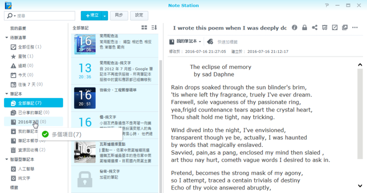 【▼】左邊的筆記本會記錄各種筆記,就像是資料夾一樣,裡面有很多檔案,小編建立一個2016年7月的筆記本。