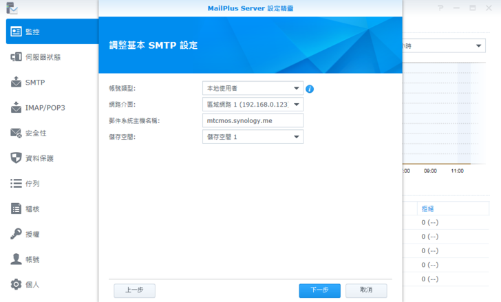 【▼】接著回到MailPlus Server輸入STMP設定,郵件系統主機名稱就打剛才申請的DDNS:mtcmos.synology.me。