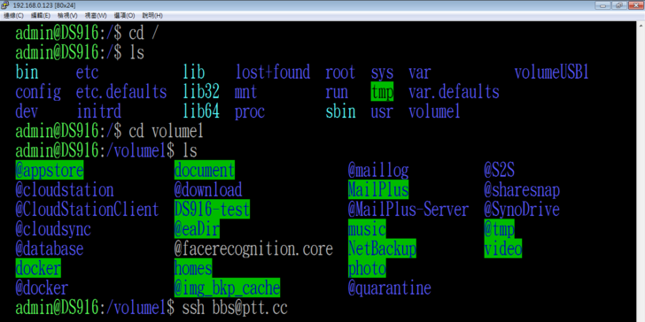【▼】真的連上了呢!OS主要應該是Linux Base,相關目錄都放在volume1的目錄中,不多說試打ssh bbs@ptt.cc。
