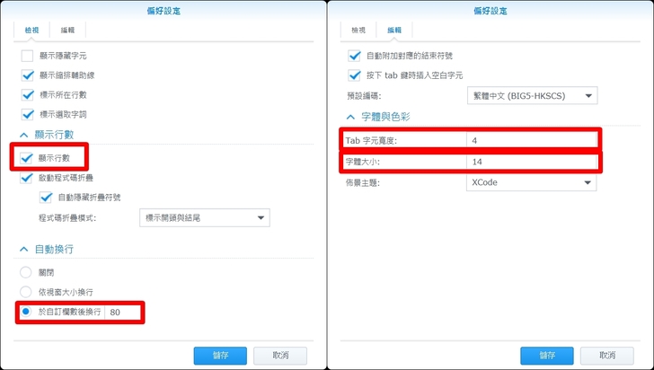 【▼】文字編輯器的設定中比較常用的就是檢視部分的顯示行數與自動80行換行,編輯部分則可以調整Tab字元寬度與字體大小。