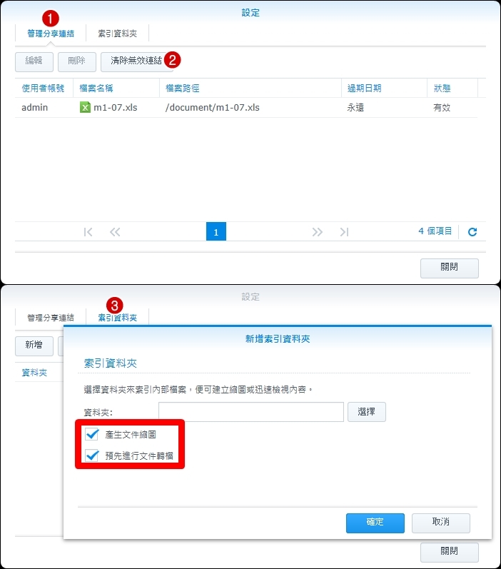 【▼】文件檢視器的設定選項方面,能清除過期的分享連結,對於文件索引的部分也能產生文件縮圖,甚至能預先將文件轉檔。