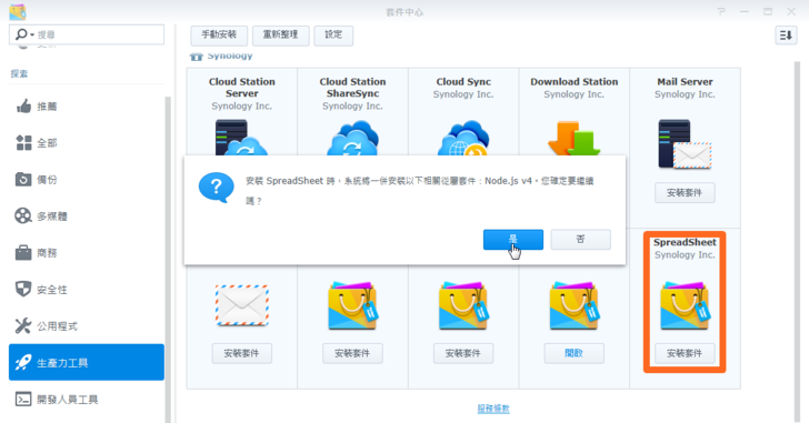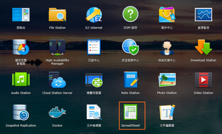 【▼】安裝方式【套件中心】->【全部】->安裝【SpreadSheet】->到【主選單】執行即可。