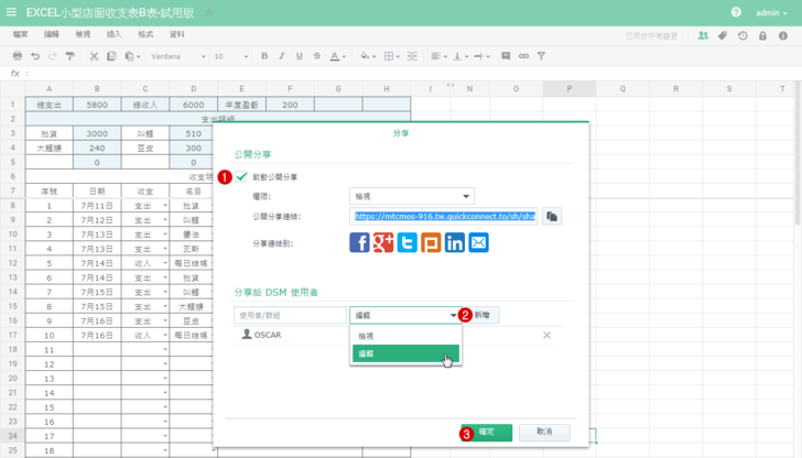 【▼】小編在此示範與他人協同工作的方式,首先需啟動公開分享,第二部輸入要共同工作的DSM帳號,在此小編設OSCAR有編輯功能,若設為檢視就無法編輯了。