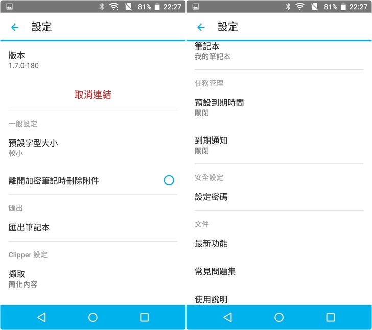 【▼】目前DS note App版本為1.7.0-180,主要能調整字型大小、離開加密筆記時可刪除附件、匯出筆記本、擷取模式的選擇等。