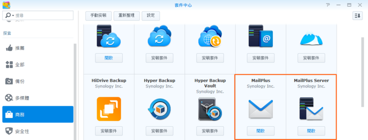 【▼】NAS上架設mail server相信很多家都有相關套件,不過步驟真的蠻繁瑣的,不過Synology推出mail server架站套件卻蠻簡單的,小編就來幫大家架設自個的mail server,不過別亂寄信給偶阿~安裝方式【套件中心】->【商務】->安裝【MailPlus Server】與【MailPlus】->到【主選單】先執行【MailPlus Server】。