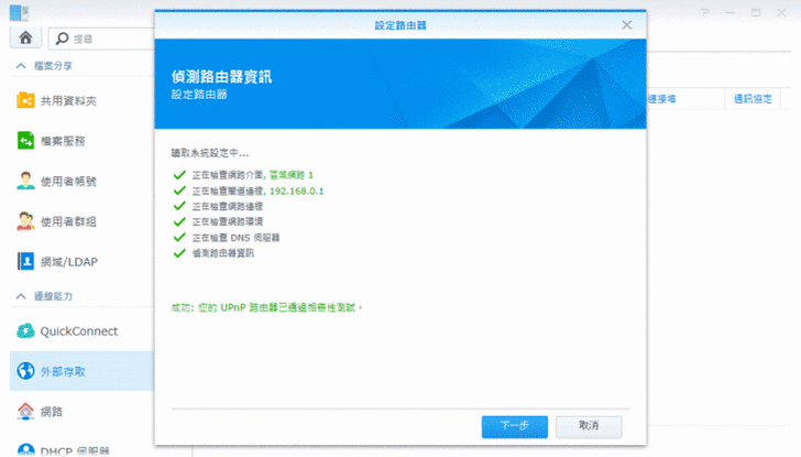 【▼】不過在架設之前,請先確定幾個要點,首先到【控制台】->【外部存取】->偵測路由器資訊,把UPnP功能給開啟。一般路由器大概都是192.168.0.1。