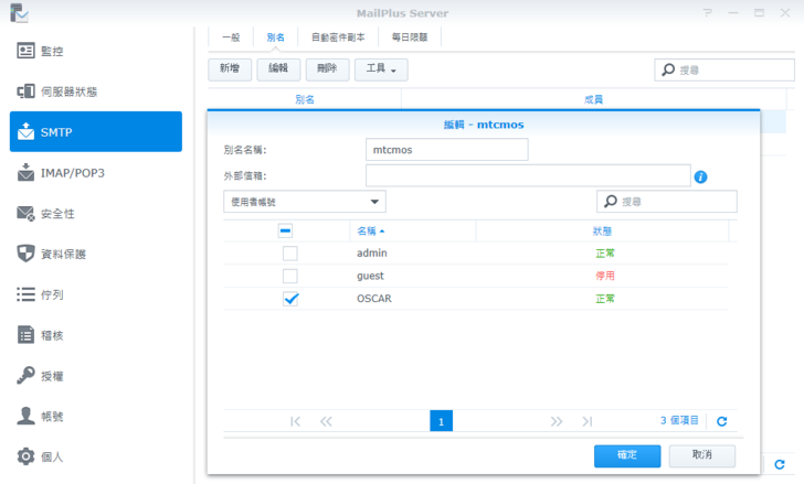 【▼】由於DSM帳號屬於自己內部管理的帳號,所以在SMTP頁面中有個別名可以作寄信時的名稱,以這個例子來說OSCAR有個mtcmos的別名,所以別人寄信給mtcmos@mtcmos.synology.me或OSCAR@mtcmos.synology.me都能被OSCAR這位大大收到。
