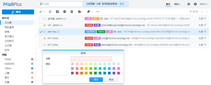 【▼】MailPlus也向Gmail一樣有豐富顏色的標籤,對於信件的分類很有幫助。