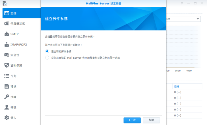 【▼】第一次開啟開MailPlus Server,會跳出設定精靈,由於是新建立就選【建立新的郵件系統】。