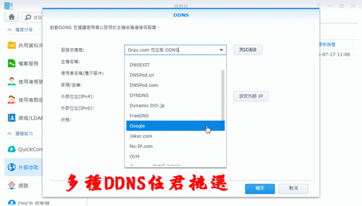 【▼】再到【控制台】->【外部存取】->【DDNS】選一個喜歡的服務供應商。小編是選Synology自家的服務,所以網址後面會多加.synology.me,記得要將DDNS的服務條款給勾起來。另外如果家中不是固定IP的話,這邊也要稍作修正,到【控制台】->【網路】->【區域網路】將其DHCP自動分配IP給取消掉,給一個目前使用的固定IP。