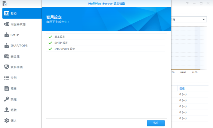 【▼】接著會自動套用SMTP以及IMAP/POP3的設定,按下完成。