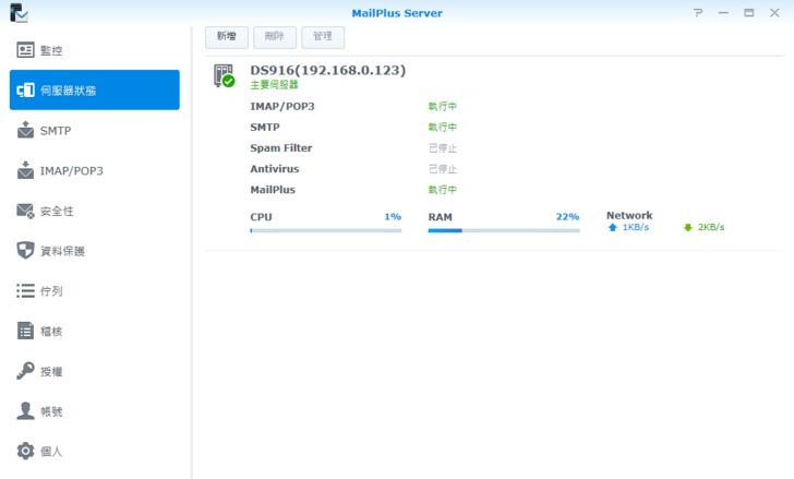 【▼】再到伺服器狀態的頁面,可以看見除了檔廣告信與防毒沒運作外,其餘都正常執行中,耗用的CPU與RAM的資源也很低。