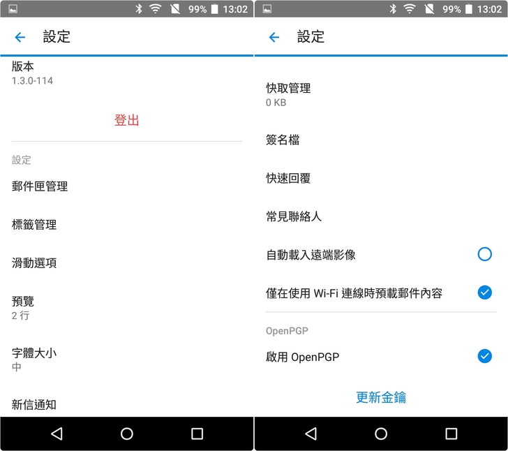 【▼】目前MailPlus App的版本為1.3.0-114,設定選項中,能建立郵件匣及標籤管理,自訂滑動手勢,並能快取機制能儲存先前讀取過的附件或圖片,事後即使沒有網路也能使用。