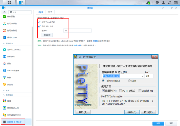 【▼】文書作業怎能忘記偷閒一下呢?測試一下【控制台】中【終端機】的功能,開啟Telnet與SSH的功能,一般Telent為23 port,SSH為22 port。並輸入DS916+的IP。