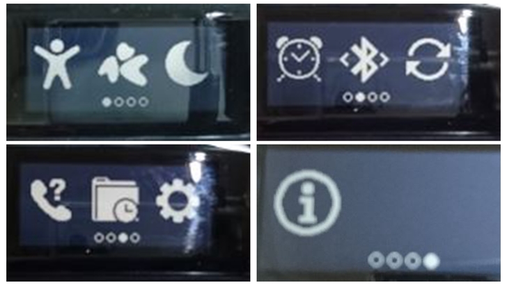 左上依序為:運動>一卡通>勿擾>鬧鐘>藍芽>同步>尋找電話>運動追蹤>設定>資訊