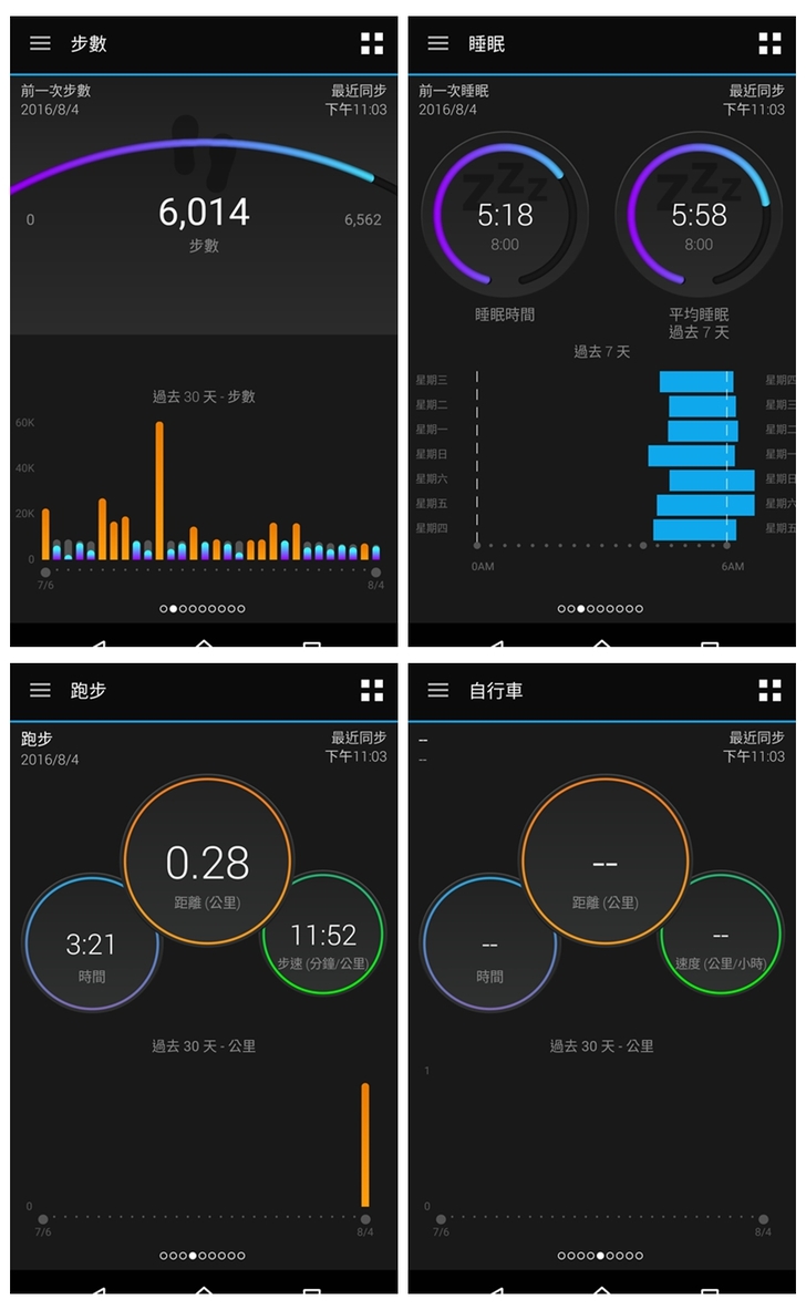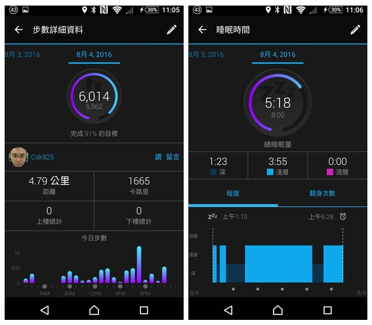 除了上圖右邊的可以在主畫面的第一頁面看到步數、睡眠時間、卡路里、強度分鐘..還可以看當天的步數,睡眠情況。