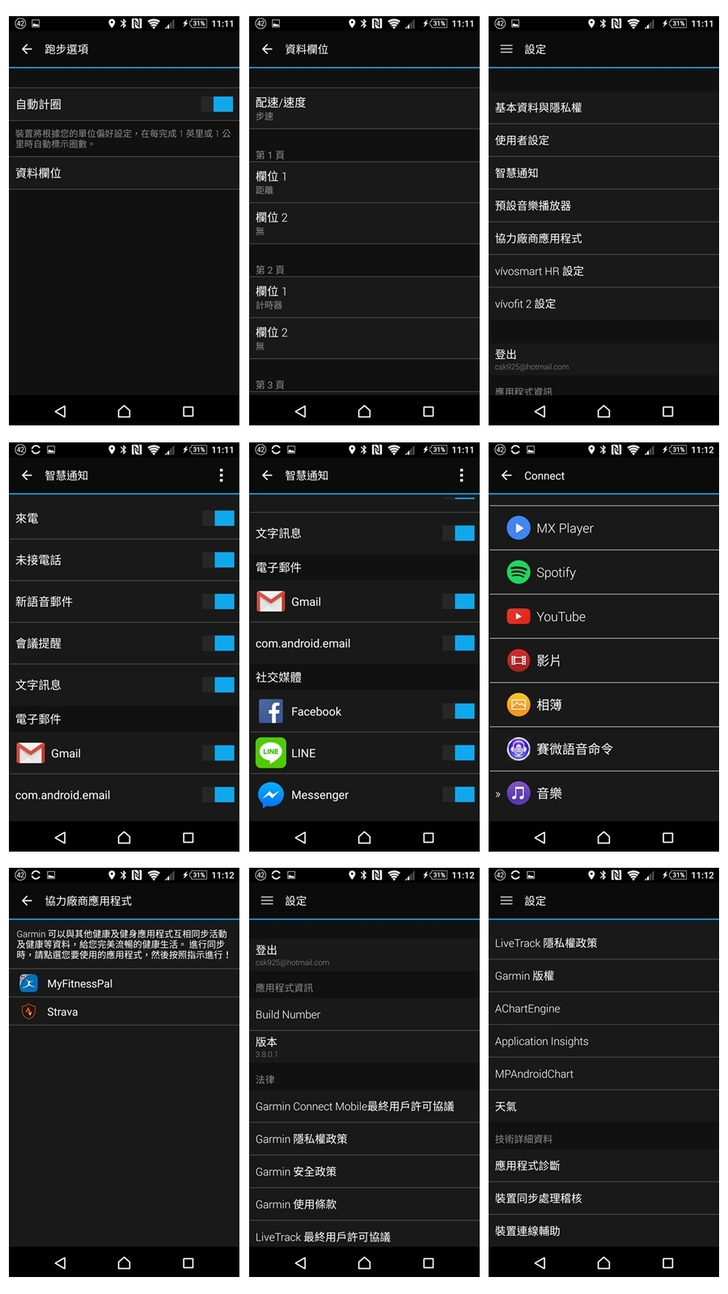 在設定內還有跑步選項\資料欄位\智慧通知\連接\協力廠商\GARMIN相關說明。