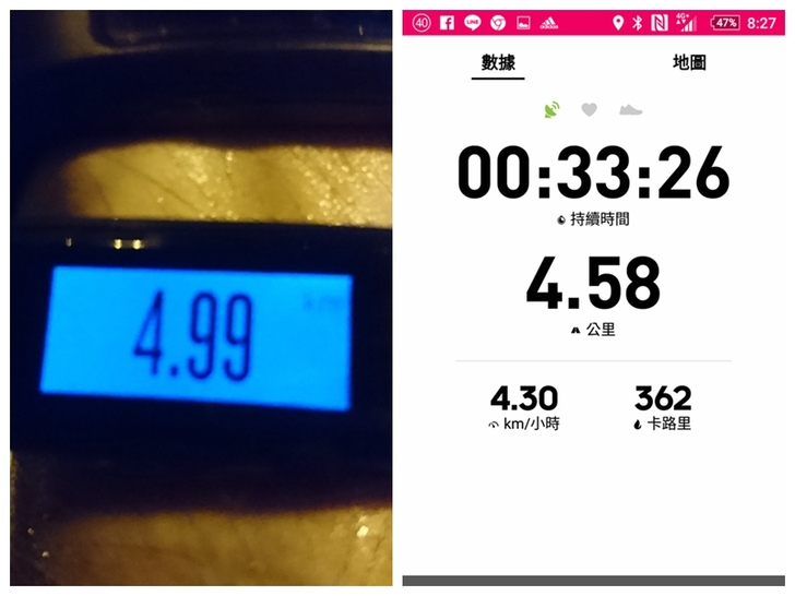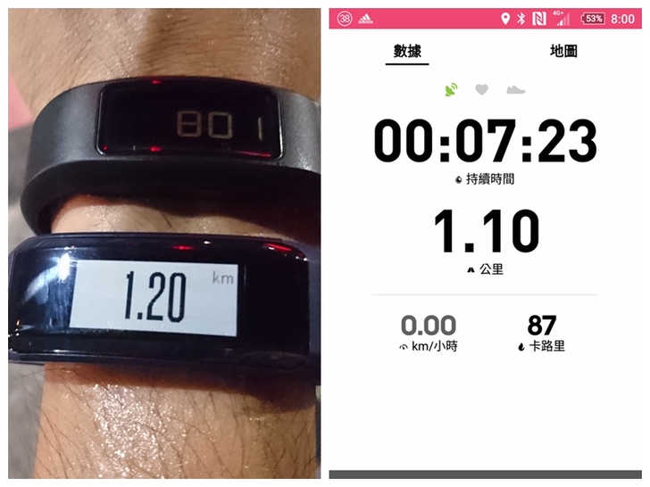 跑到這已1.1K(左為手環預估1.2KM,右為ADIDAS APP GPS測1.1KM)