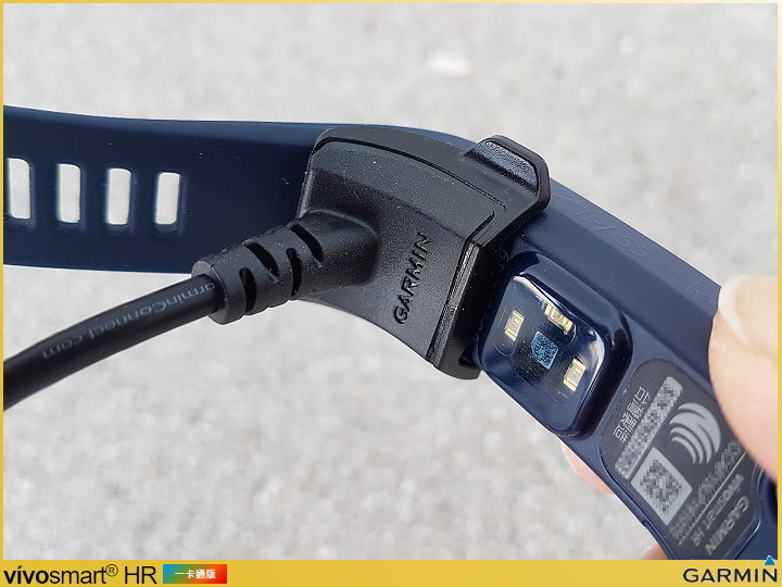Garmin vivosmart HR 一卡通版本體背面有接點,可配合附贈的 USB 充電/電腦傳輸線進行充電或電腦傳輸資料。