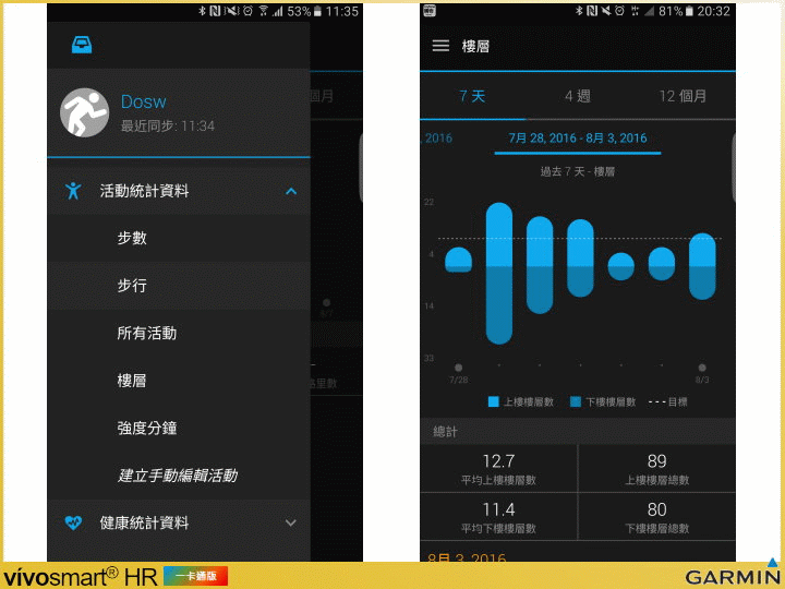 活動統計資料中,可查詢步數、步行、所有活動、樓層、強度分鐘等資訊。