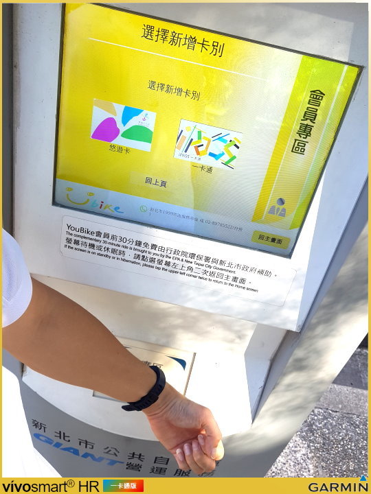 除了便利商店或全聯買東西、坐公車搭捷運外,使用 Garmin vivosmart HR 一卡通版來租借 YouBike 也可以,記得要先增新卡別才能租借喔!!