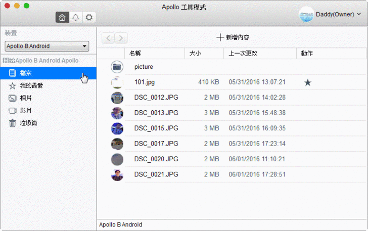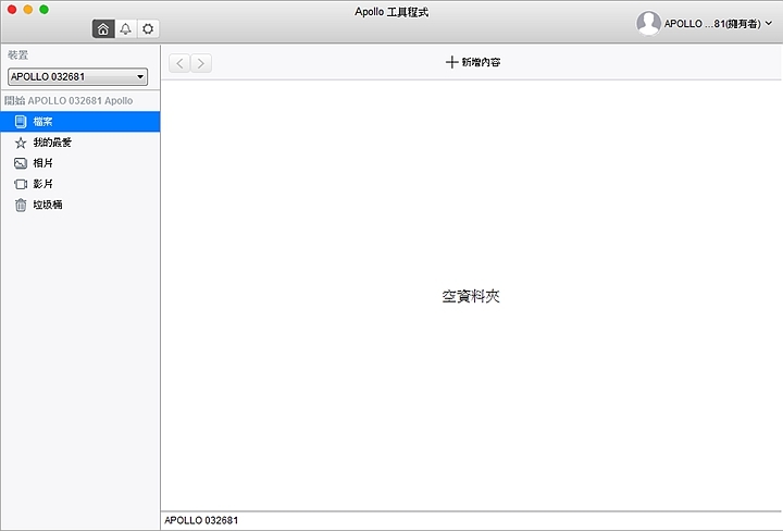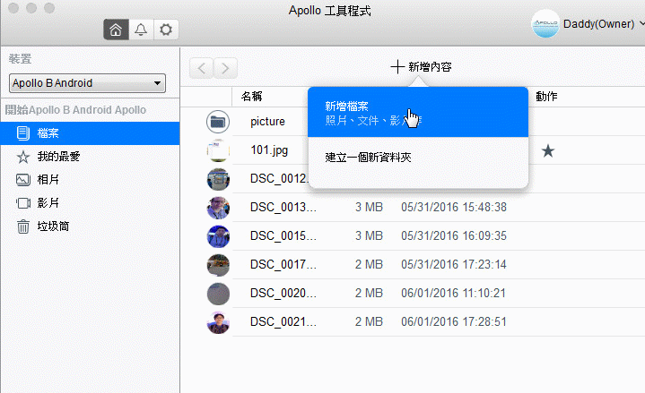 ▼只要點選新增功能,就能將電腦裡的檔案或是手機裡的照片影片,快速上傳到Apollo Cloud裡面。