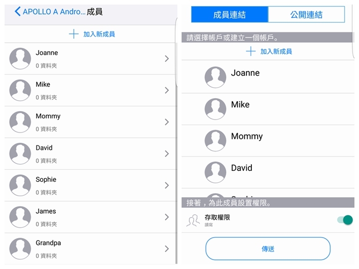 ▼當然,除了分享給群組外的朋友,你也可以快速分享給同一個Apollo Cloud上的成員。當點選分享給成員後,系統會跳出目前所有成員的名字,點選想要分享的成員後,就能快速將檔案分享共用給群組內的成員。另外,在下方你可以對成員進行權限的管制,限制成員修改檔案,避免資料遭修改。