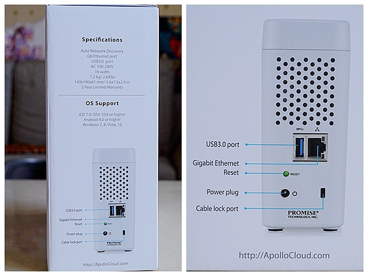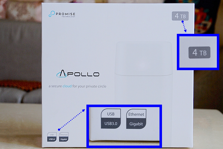 ▼Apollo Cloud 以白色外包裝為主色,象徵雲端儲存的主體,而且正面上可看到4TB的儲存容量硬碟,讓人一眼就了解到裡面的大容量儲存空間,另外,USB3.0,Gigabit 網路接口,也可以看到Apollo Cloud配備的硬體等級都是目前最高了。