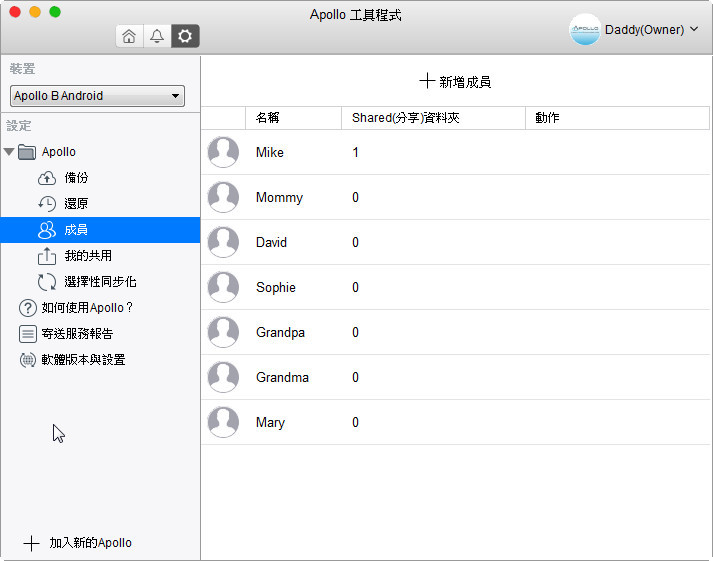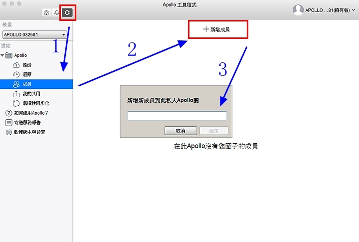 ▼Apollo Cloud的設定裡點選齒輪,然後再選擇成員,這時你會看到右邊視窗,目前是沒有新的成員,接下來點選新增成員,填上新增的用戶名。