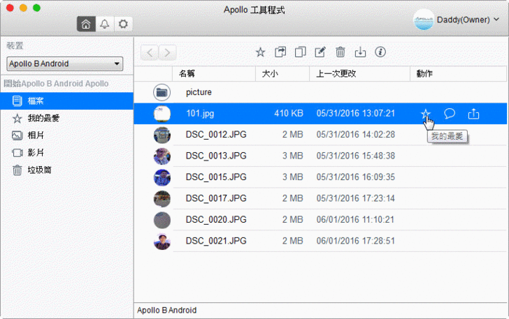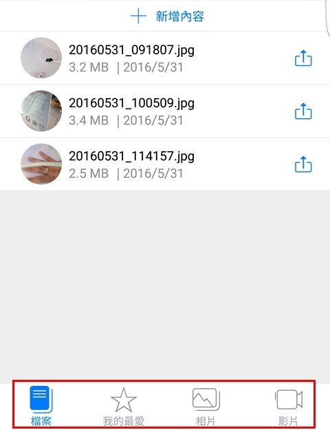 ▼簡單易用:Android用戶端的APP,大致都和電腦版的一樣,介面甚至更為簡單,如同主畫面介面一樣,在下方依序可看到檔案,我的最愛,相片和影片等點選功能。