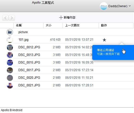 ▼共用分享:在Apollo Cloud上,想要進行檔案分享共用,是非常方便的一件事,只要點選檔案後方的"共用",就能馬上產生連結碼。