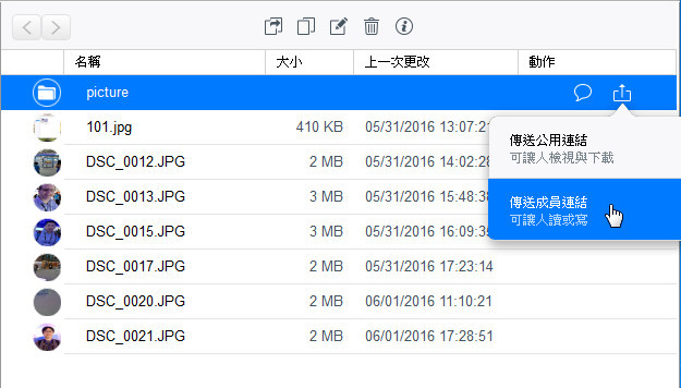 ▼便利分享:透過APP,你也可以輕鬆進行檔案分享共用,非常方便也很簡單,只要點選檔案後方的"共用",就能馬上產生連結碼。