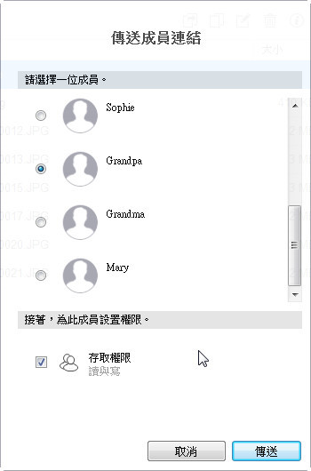 ▼當點選分享給成員後,系統會跳出目前所有成員的名字,點選想要分享的成員後,就能快速將檔案分享共用給群組內的成員。另外,在下方你可以對成員進行權限的管制,限制成員修改檔案,避免資料遭修改。