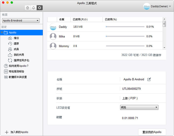 ▼而在設定管理介面上,也可以清楚看到每位使用者已經儲存的空間容量,以及目前所有空間剩餘的容量,讓你能一 目了然Apollo Cloud的狀態。