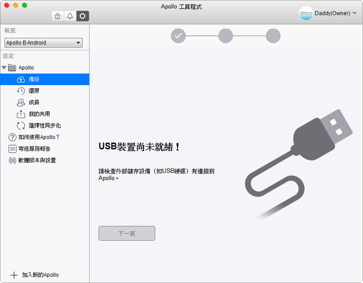 ▼透過Apollo後面的USB 3.0接孔,可以外接上USB隨身硬碟,進行Apollo Cloud所儲存資料的備份以及還原,不過要確定外接硬碟的容量要大於儲存備份的容量,不然會備份失敗的。