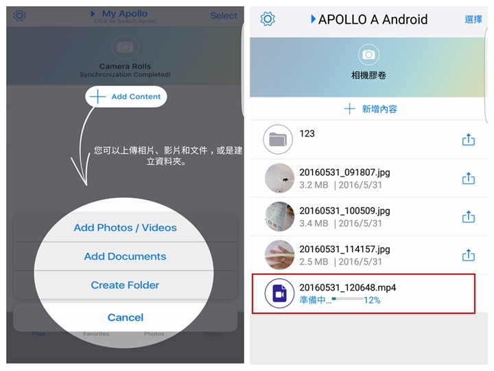 ▼而上傳檔案到Apollo Cloud也很便利,點選+新增內容,點選想要上傳的檔案,就能將檔案備份至Apollo Cloud的4TB硬碟裡,4TB硬碟足足能讓使用者儲存並分享超過 440 小時的高畫質影片、22 萬張相片以及數十萬首歌曲(計算平均值:高畫質影片 = 每小時 9GB。5 分鐘的 MP3 = 每首曲目 0.007 GB。1,200 萬畫素相片 = 每張相片 0.018 GB),不論使用者位在何處,都能能任意從手機、平板、與電腦存取個人數位內容。