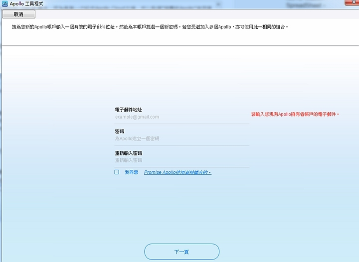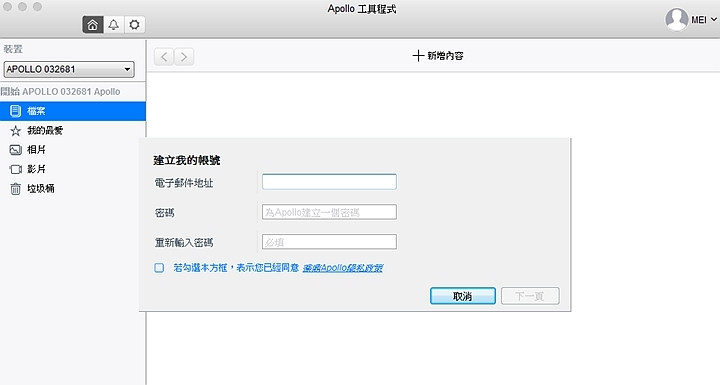 ▼緊接著,要設定一組EMAIL帳號,這組帳號將跟你的Apollo Cloud主機連結在一起,換句話說,以後只要透過帳號就能自動連線到你的Apollo Cloud主機了。